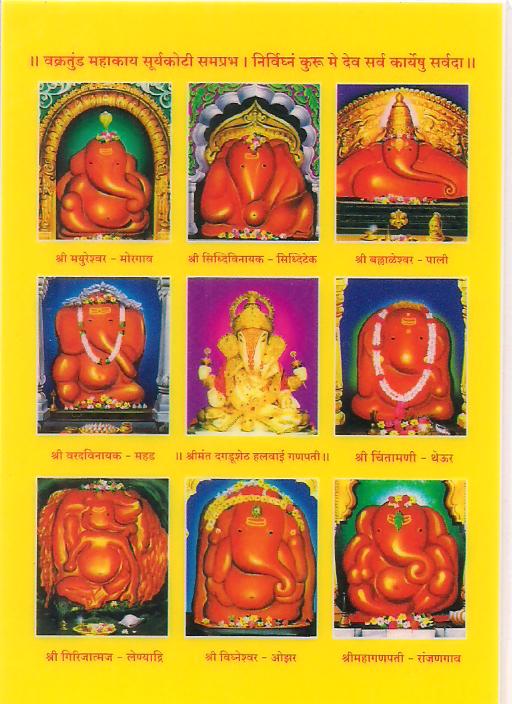 The Ashtavinayaka yatra or pilgrimage covers the eight ancient holy temples of Ganesha which are situated around Pune. Each of these temples has its own individual legend and history, as distinct from each other as the murtis in each temple. The form of each murti of Ganesha and His trunk are distinct from one another. However, there are other temples of eight Ganesha in various other parts of Maharashtra; the ones around Pune are better known than the former.